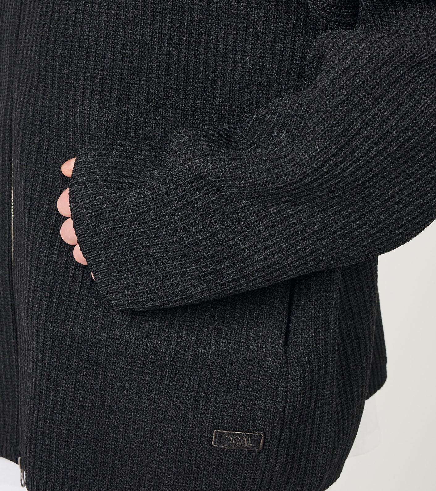 ・Zip-up cardigan finished in 5-gauge modified rib knit.