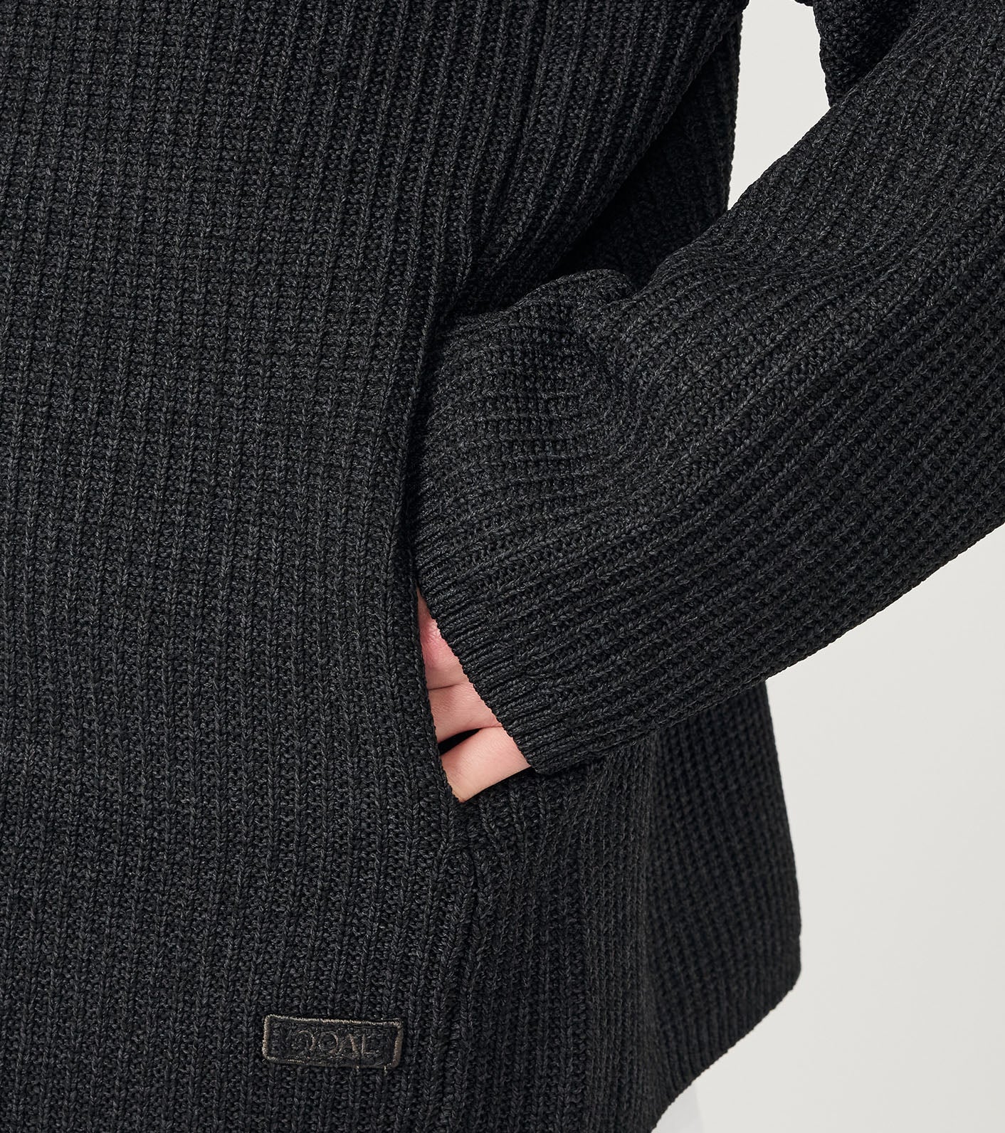・Zip-up cardigan finished in 5-gauge modified rib knit.