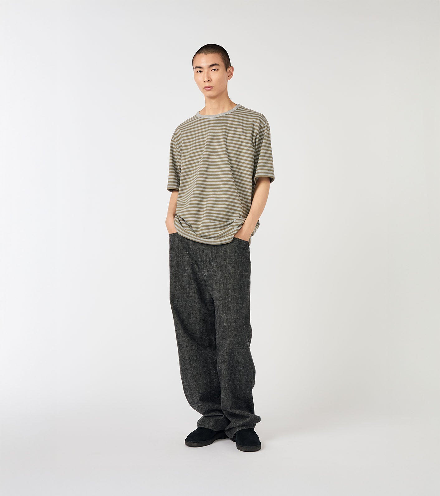 ・Developed unique thick slub yarn with recycled polyester wrapped in cotton, then dyed using rope dyeing technique. This yarn is used in the warp, and vintage-like thick cotton nep yarn is used in the weft.