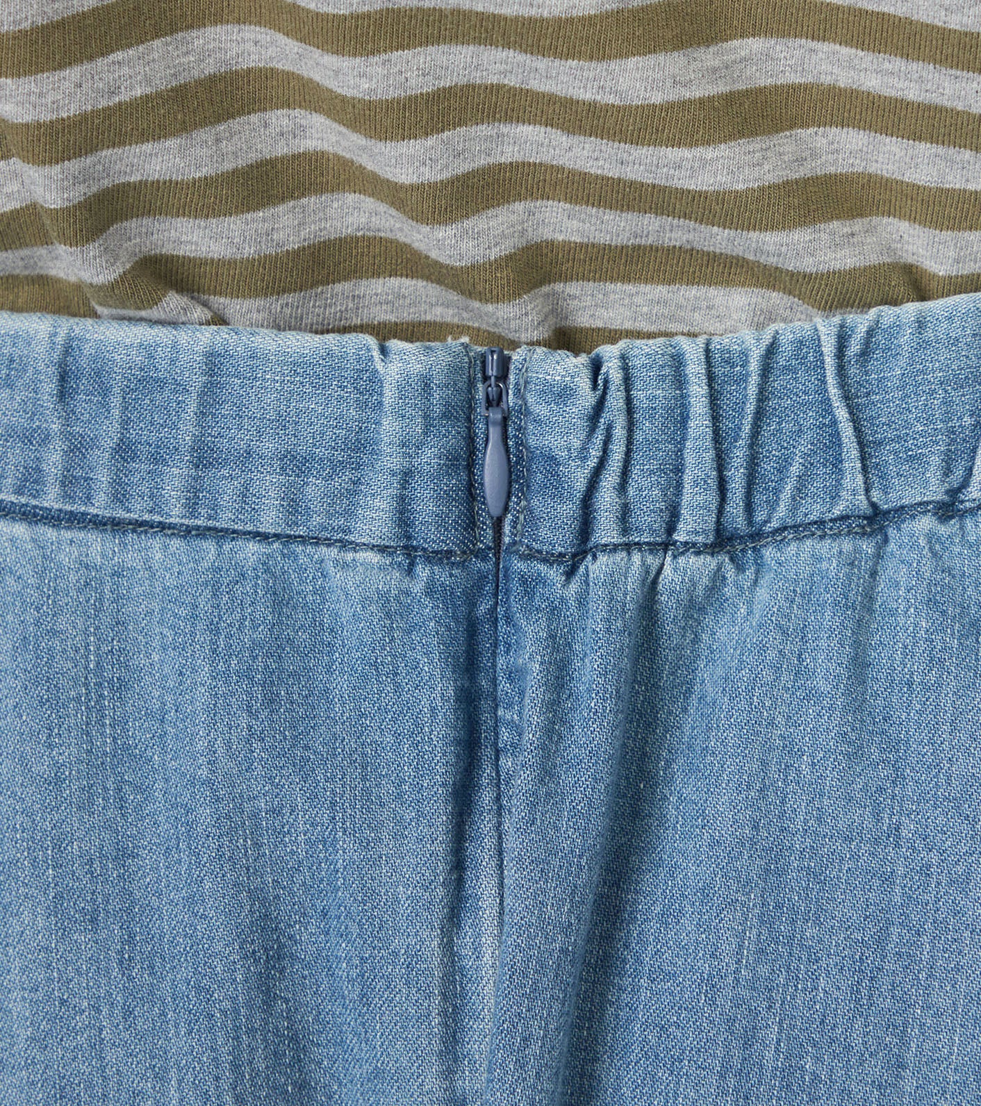 ・Warp yarn is cotton, weft yarn is covering core yarn made from organic cotton and recycled polyester, resulting in an 8oz lightweight denim.