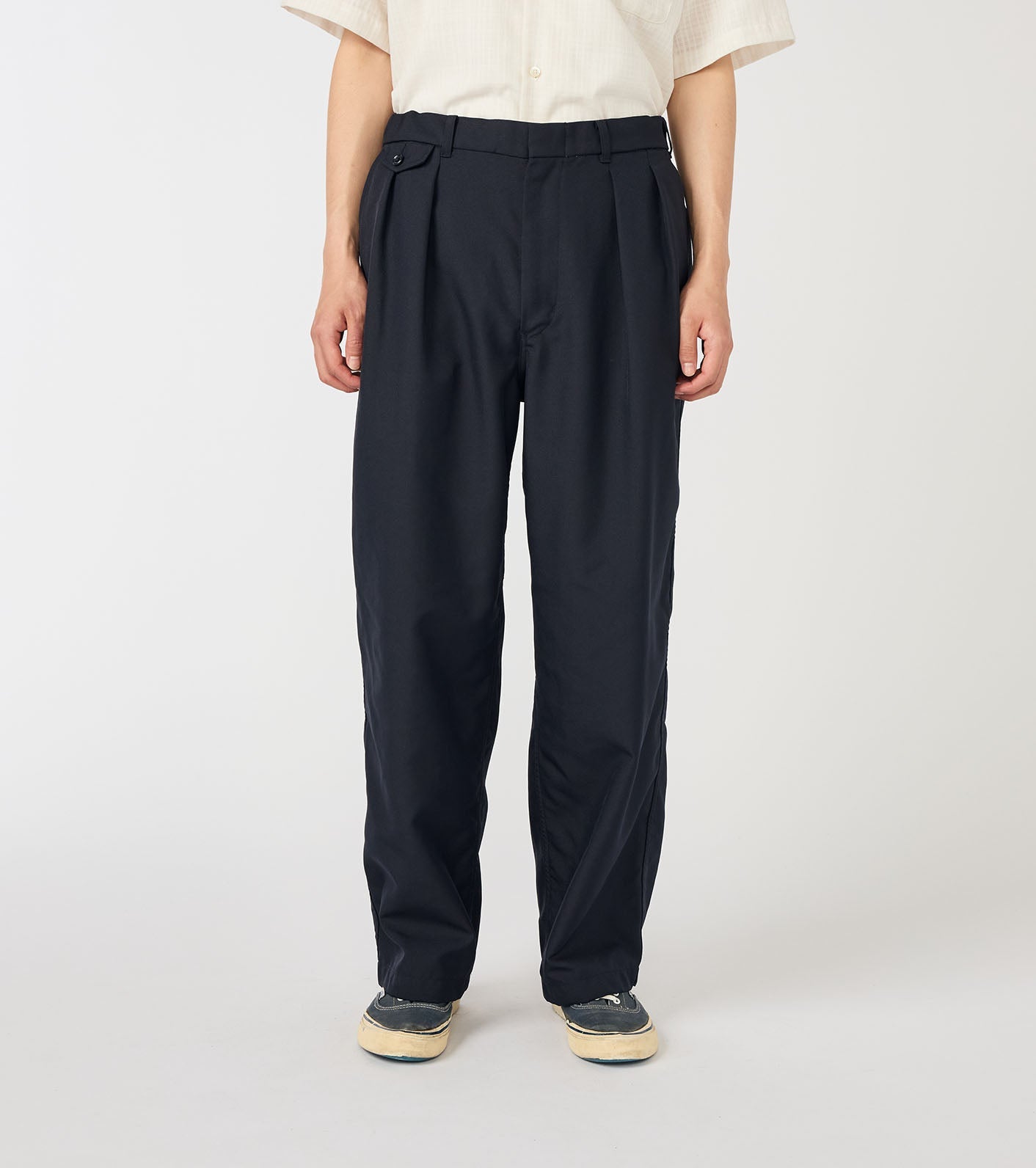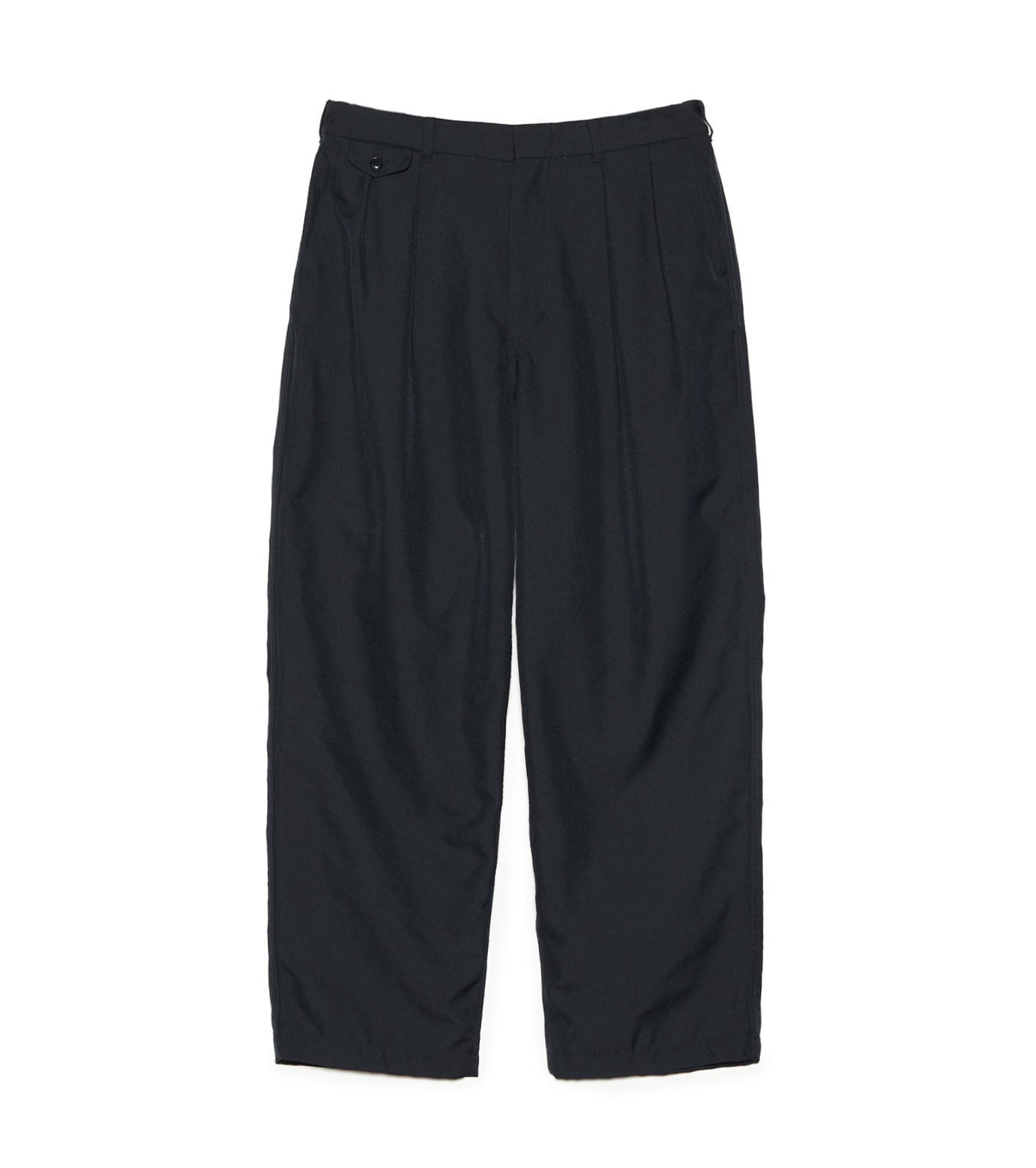 ・Wide straight-cut two-tuck pants made with polyester twill for the outer shell.